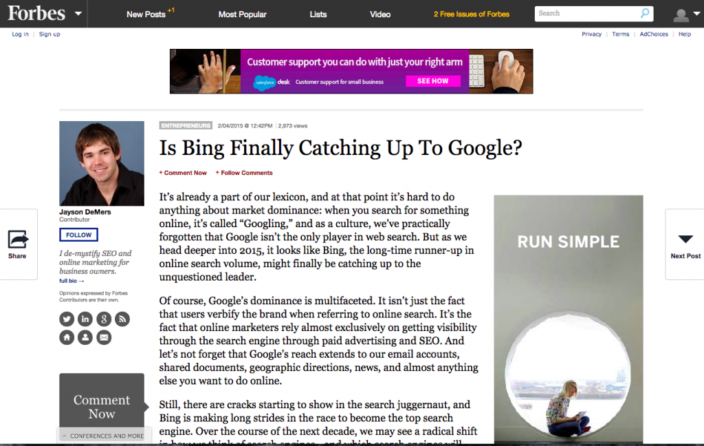 The biggest advantage Bing has over Google right now is their paid advertising platform. Undoubtedly, Google PPC ads are some of the easiest ads to manage, and some of the most visible ads you can get on the web. However, Bing is closing the gap between the two search giants by offering more niche advertising, and at lower prices due to the lack of significant competition. According to Forbes colleague and PPC guru John Rampton, “Advertisers on Bing ads can get just as much practicality as they can using Google AdWords, but at much lower costs.”